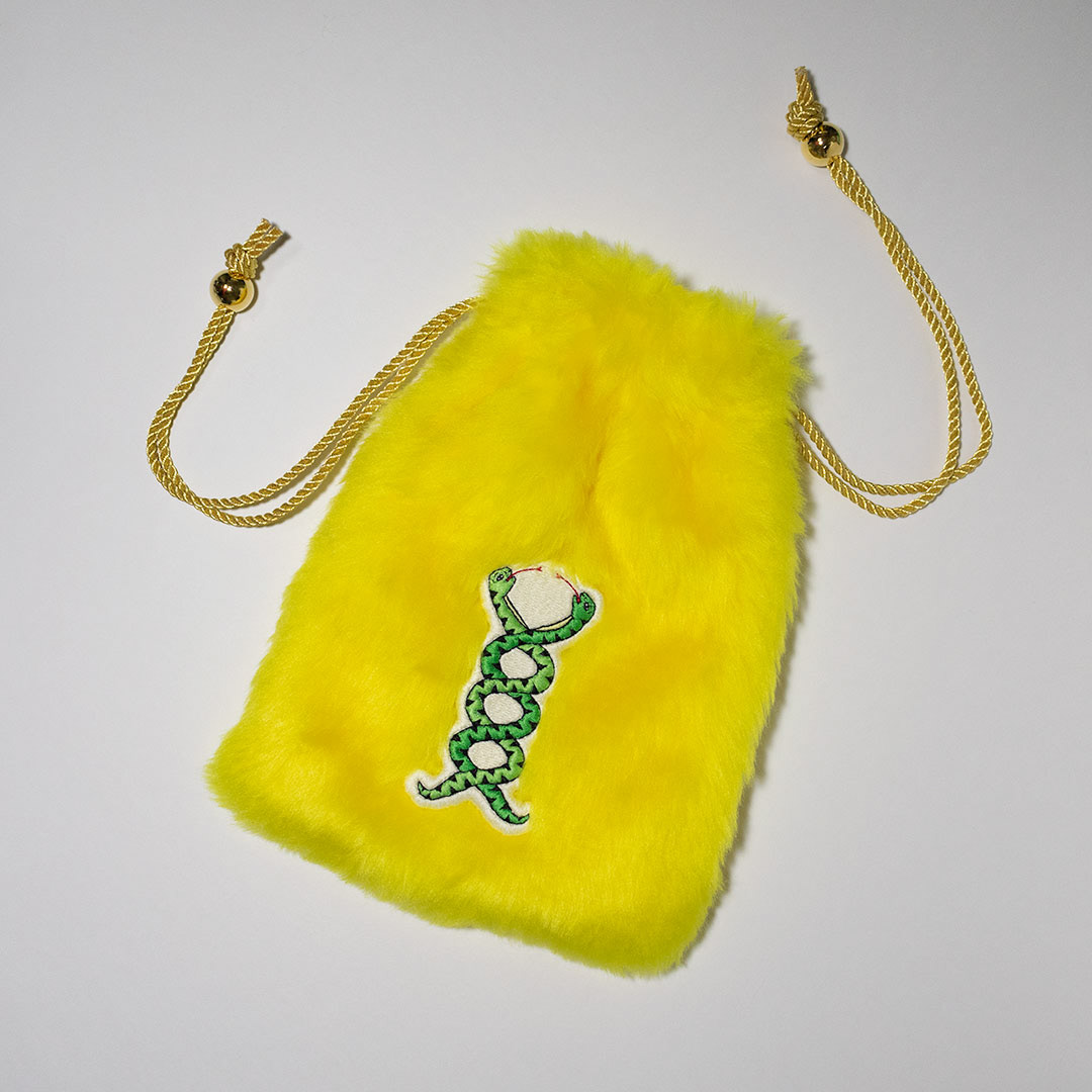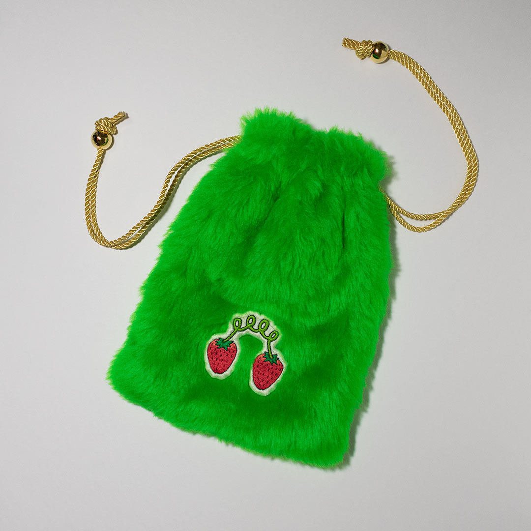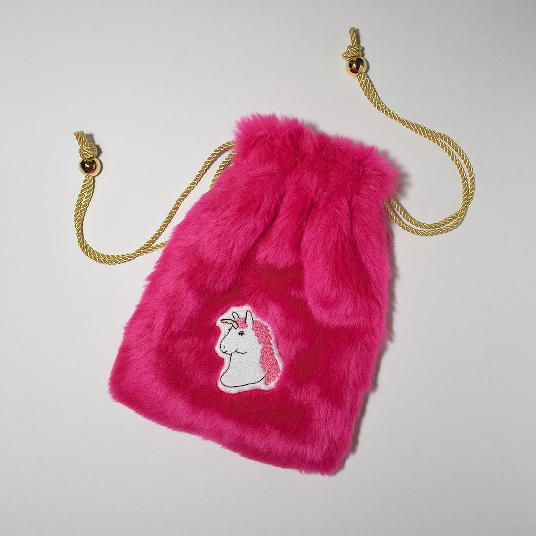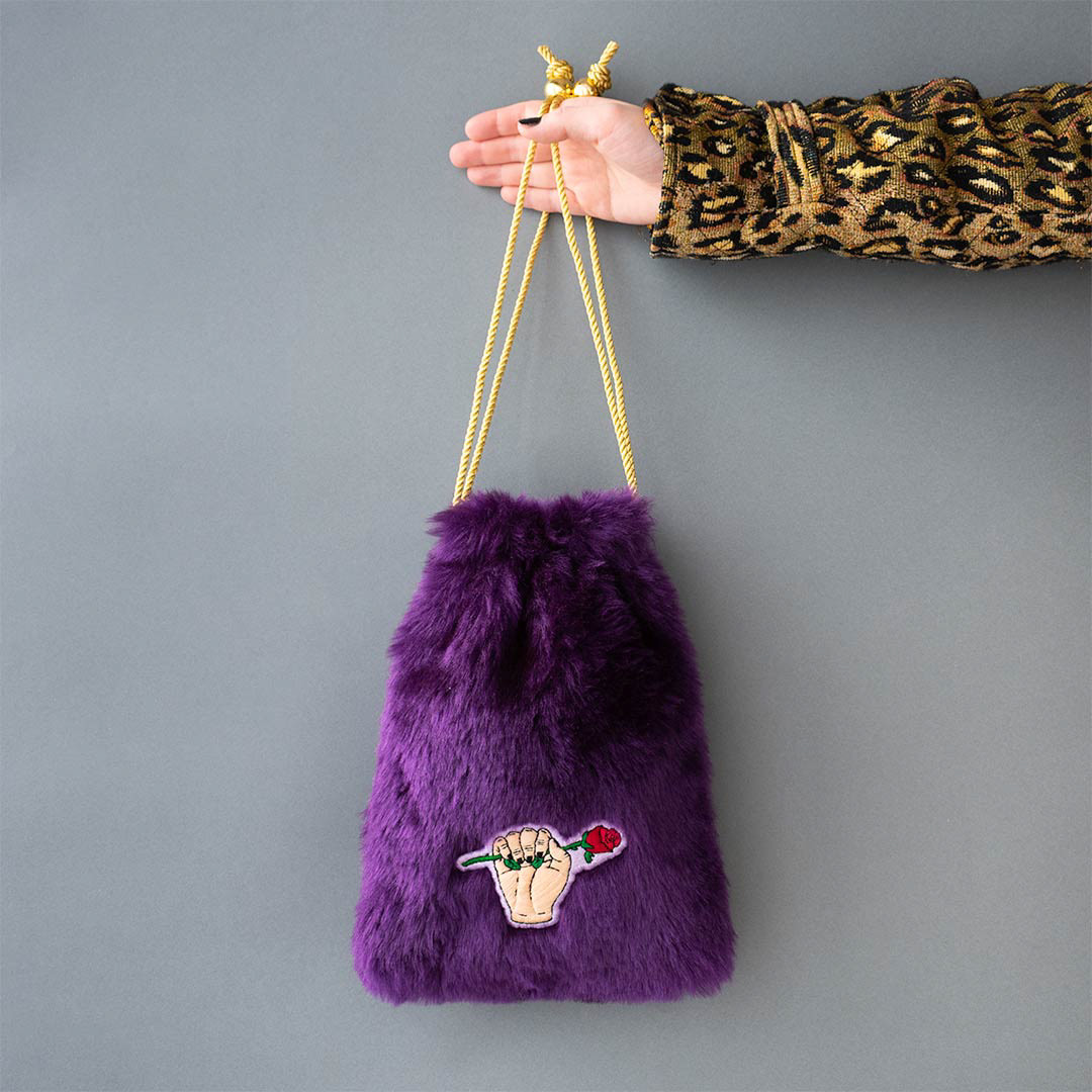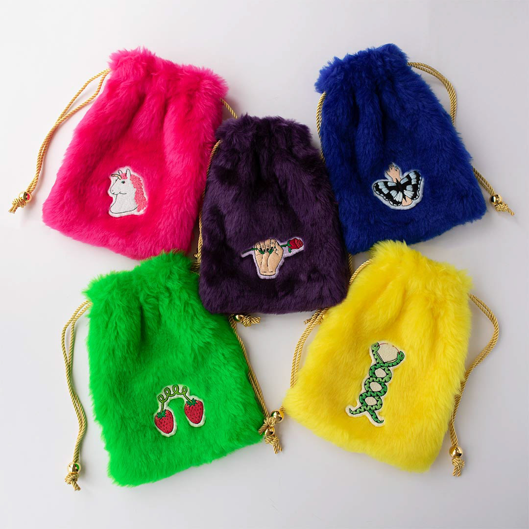 フェイクファー刺繍巾着バッグ ふわふわのフェイクファーと手刺繍ワッペンを組み合わせた巾着バッグです。 フェイクファーにやや艶があり、ふわふわしてかわいいです。(※販売は終了しました。今後販売の予定はありません。)