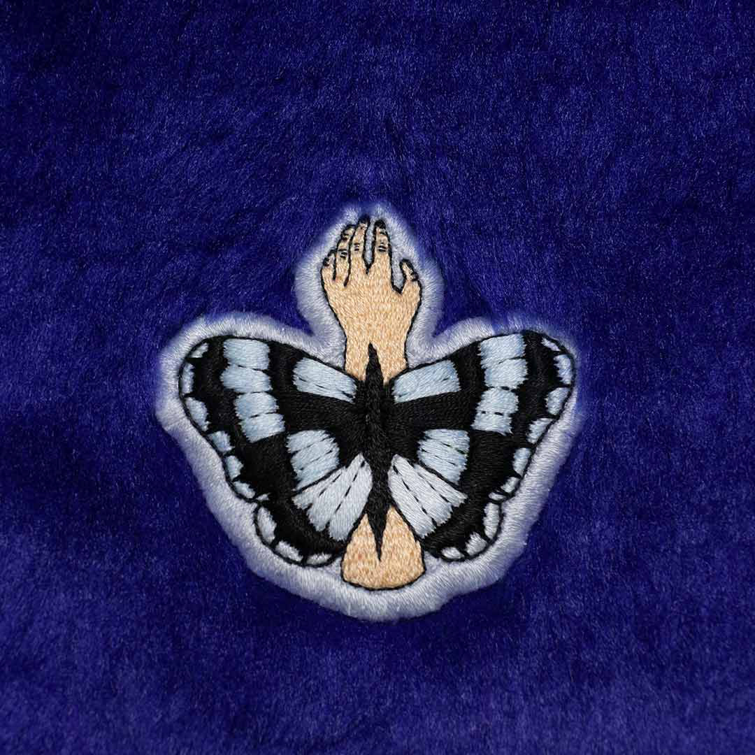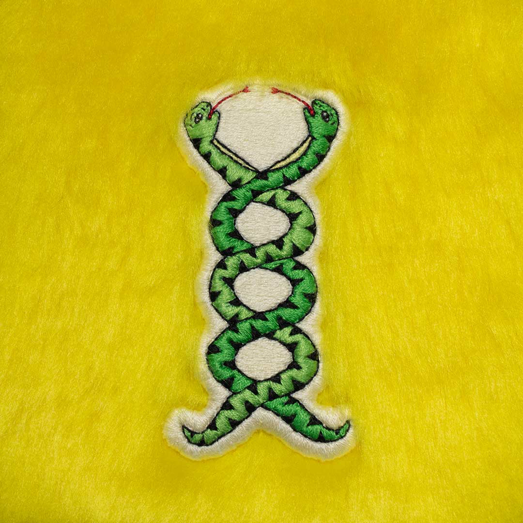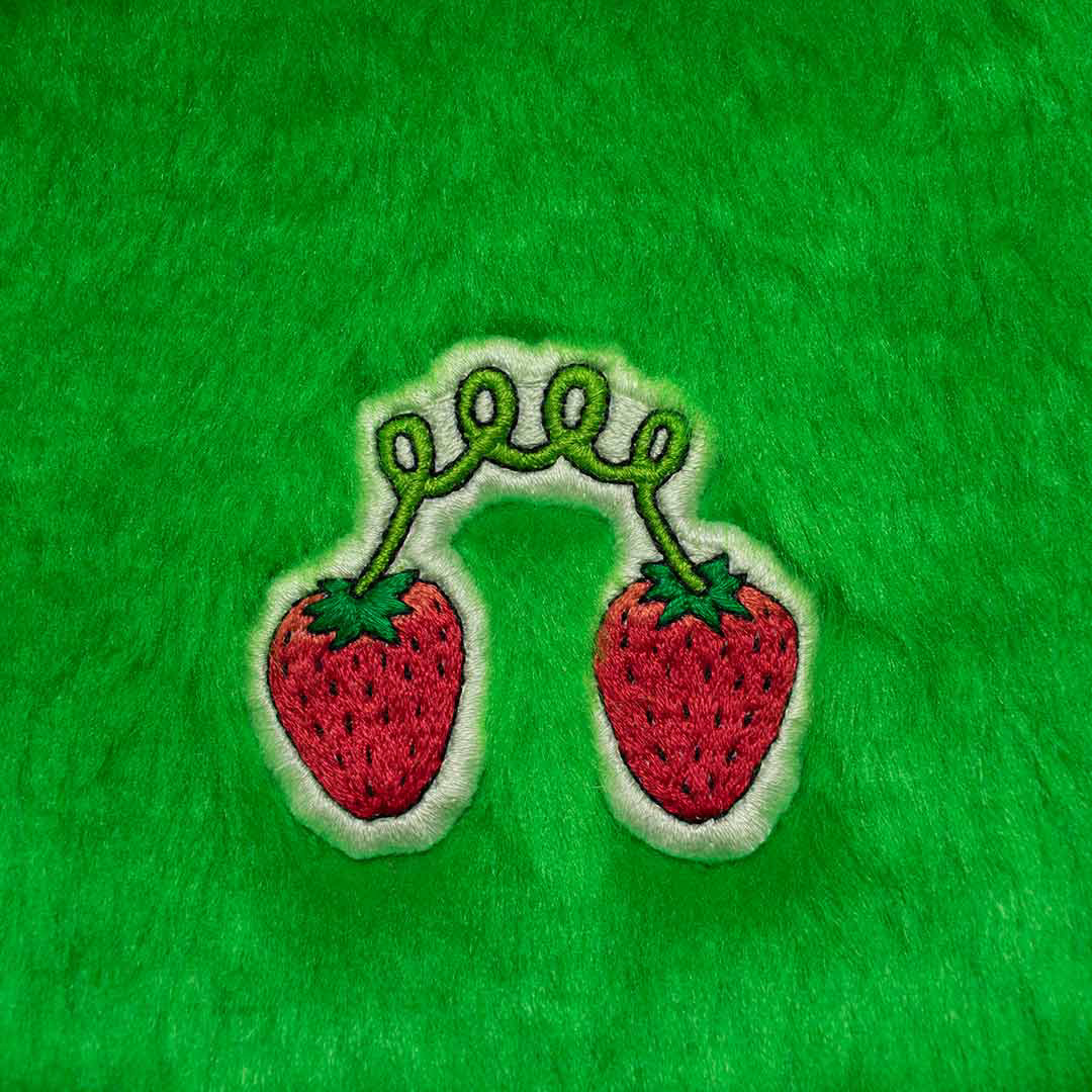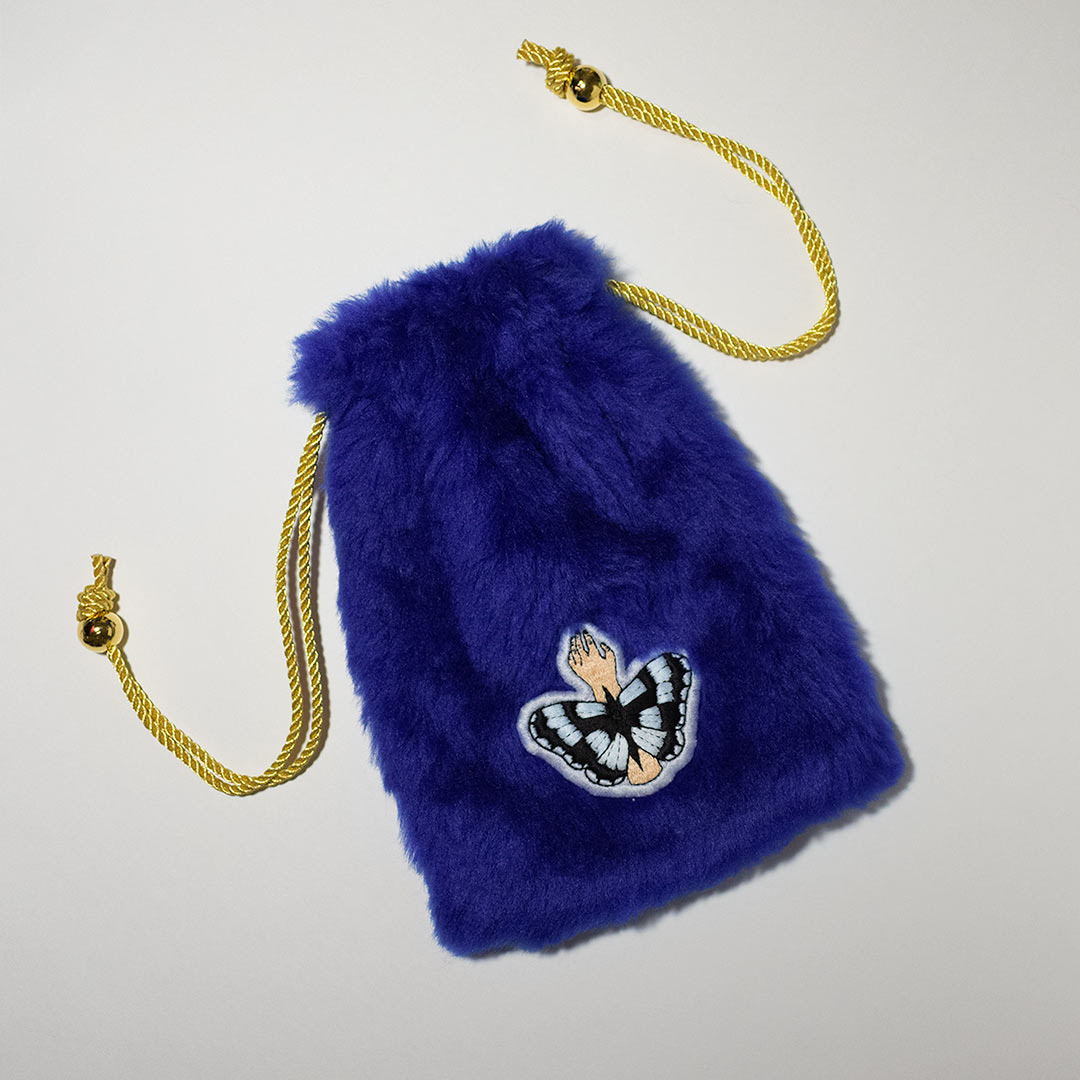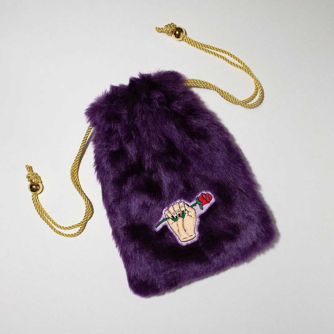 フェイクファー刺繍巾着バッグ ふわふわのフェイクファーと手刺繍ワッペンを組み合わせた巾着バッグです。 フェイクファーにやや艶があり、ふわふわしてかわいいです。(※販売は終了しました。今後販売の予定はありません。)