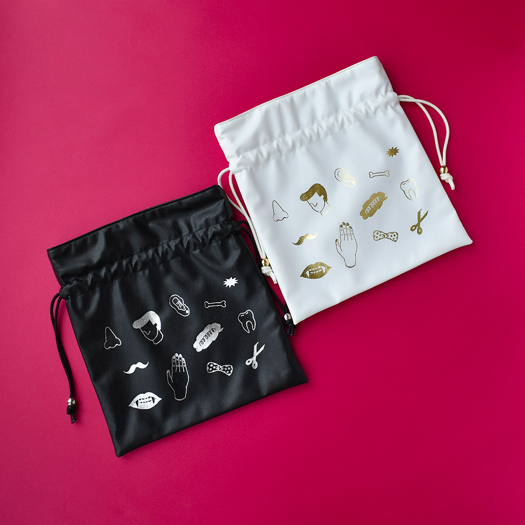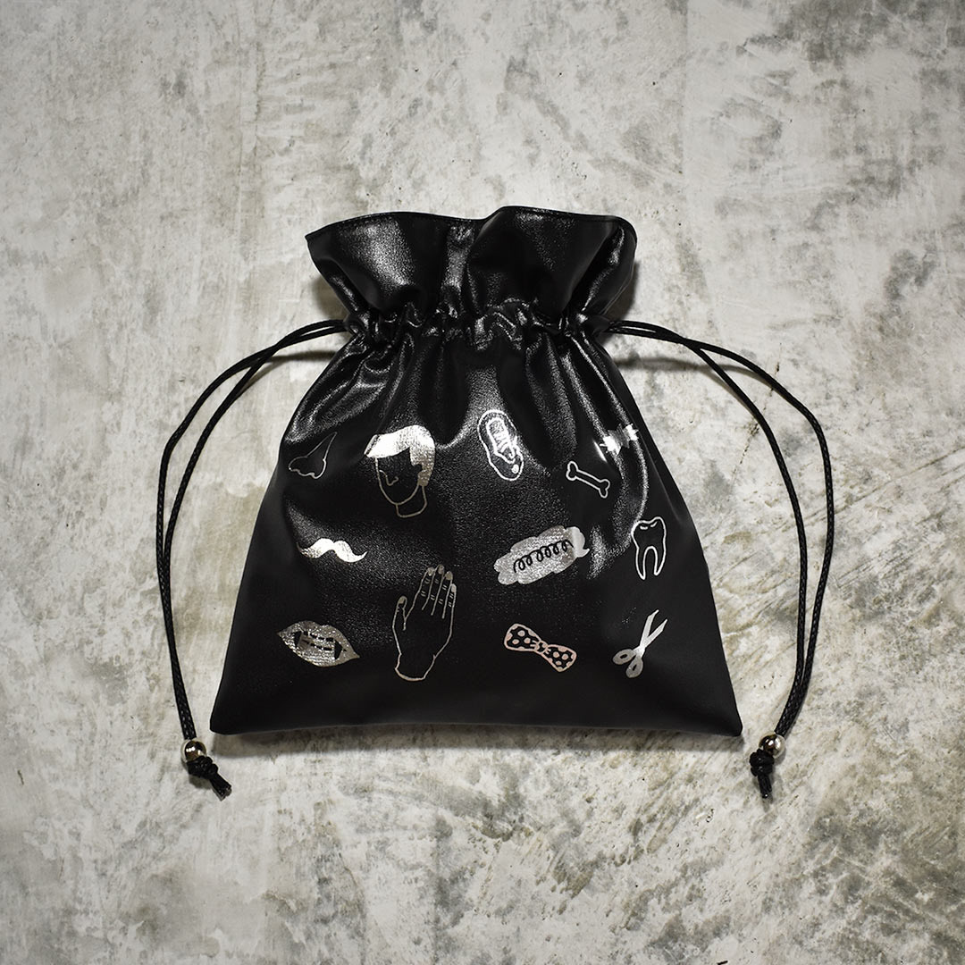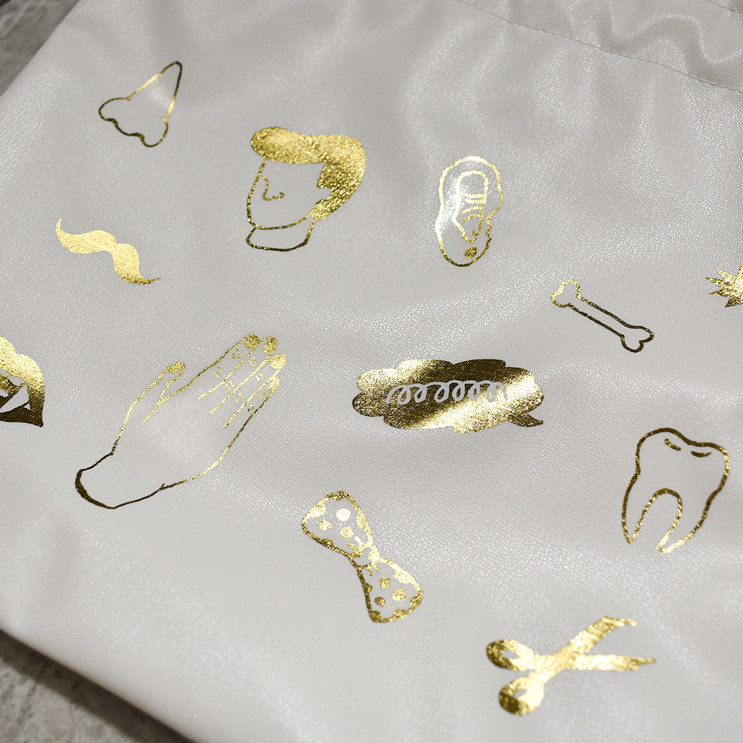 箔プリント巾着バッグ 薄手のフェイクレザーに、ひげやリボンなどユニークな柄を箔プリントしました。 箔プリントは角度によって輝き具合が変わるところもポイントです。フェイクレザーにもやや光沢があり、ソフトな手触りです。