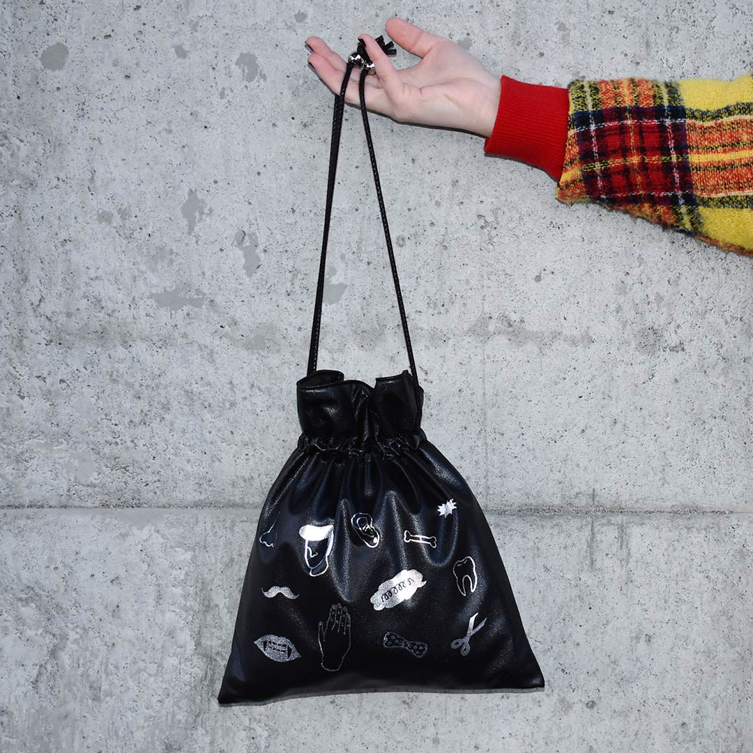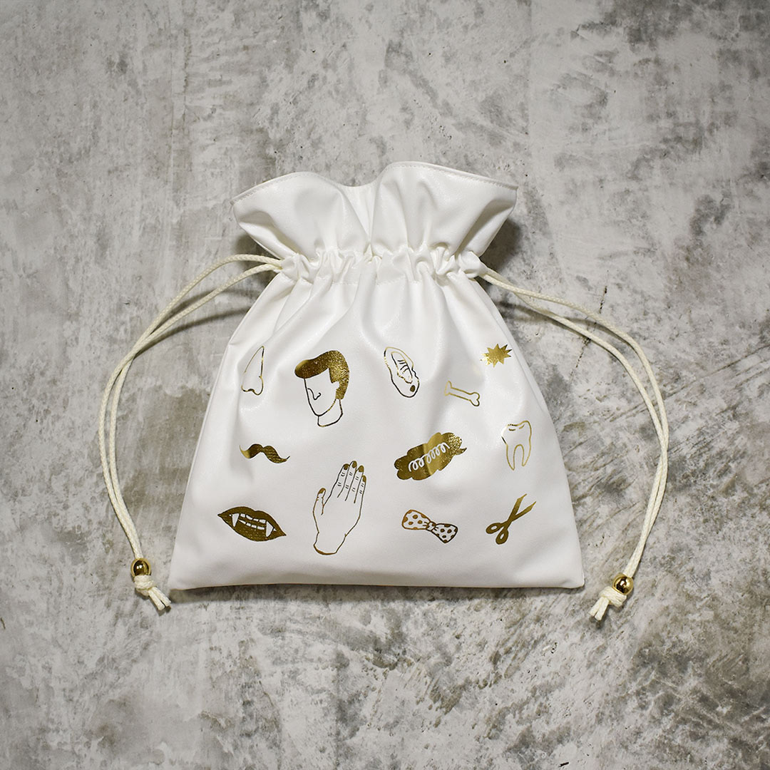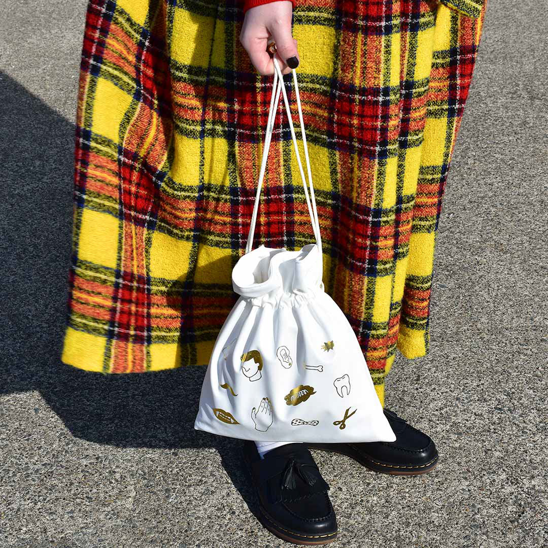 箔プリント巾着バッグ 薄手のフェイクレザーに、ひげやリボンなどユニークな柄を箔プリントしました。 箔プリントは角度によって輝き具合が変わるところもポイントです。フェイクレザーにもやや光沢があり、ソフトな手触りです。