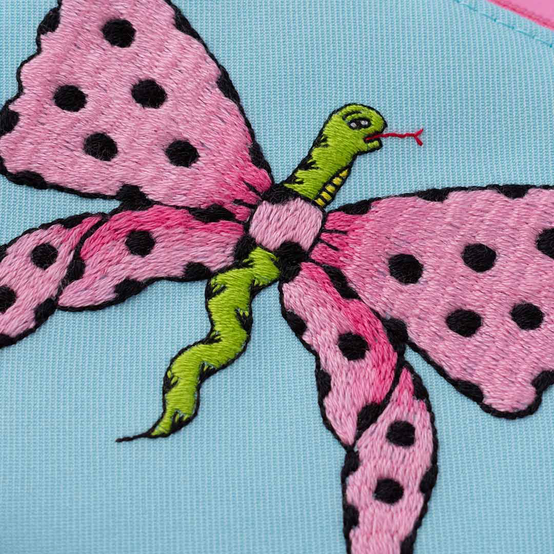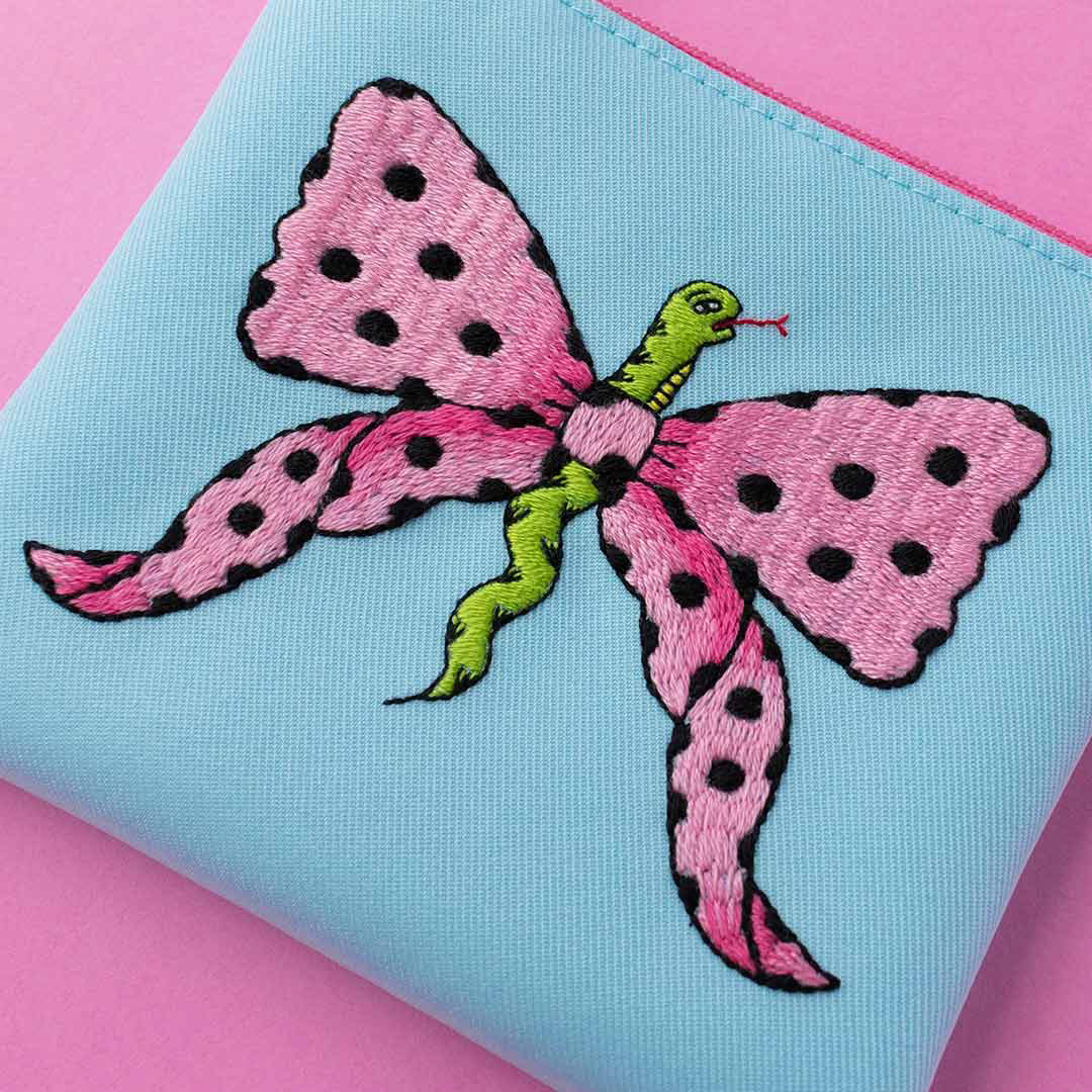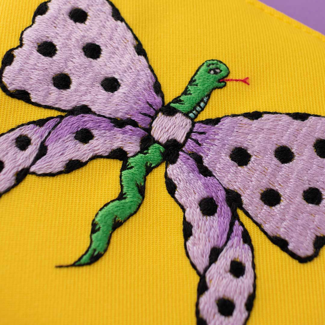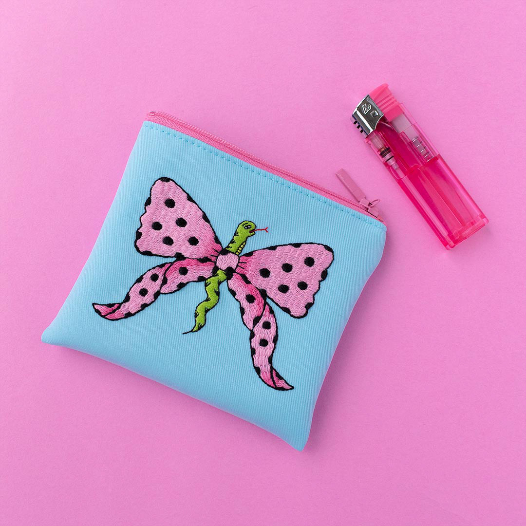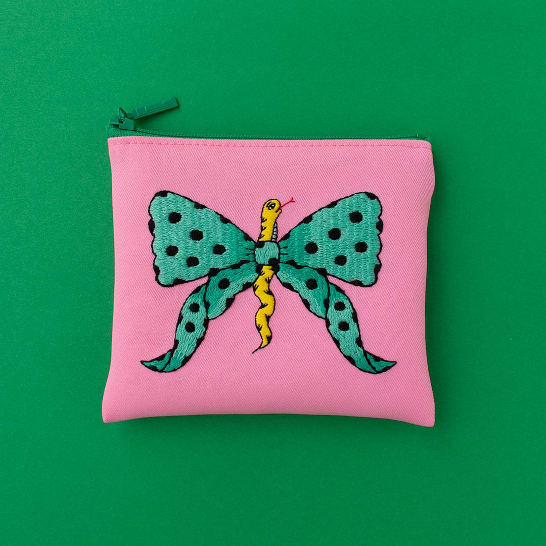 リボンと蛇の刺繍ミニポーチ リボンと蛇を刺繍した小物入れポーチです。ポリエステルツイルの生地に直接刺繍をしました。リボン部分が、少しグラデーションの刺繍になっているところがポイントです。 コンパクトなサイズなので、USBやライター、小物などを入れてお使いいただけます。(※販売は終了しました。今後販売の予定はありません。)